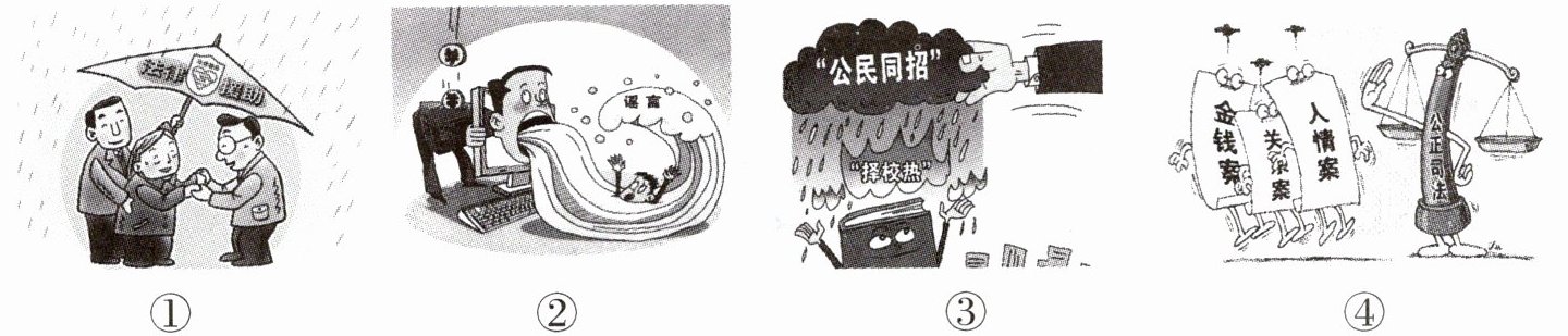 3. 公平正义是人类追求的目标,国家一直在努力建设公平正义的社会。下列漫画能体现这一要求的有 ……………………………………………………………………………………… ( )