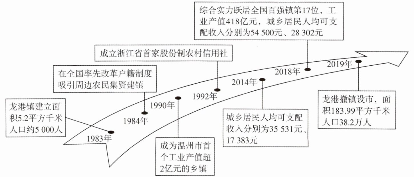(1)示例:改革开放以来,龙港镇经济迅速发展;人民生活水平不断提高;城市规模扩大,社会保障不断完善,综合实力不断增强。(结合龙港发展历程,从经济社会发展、人民生活等角度回答,写出两点即可,4分)