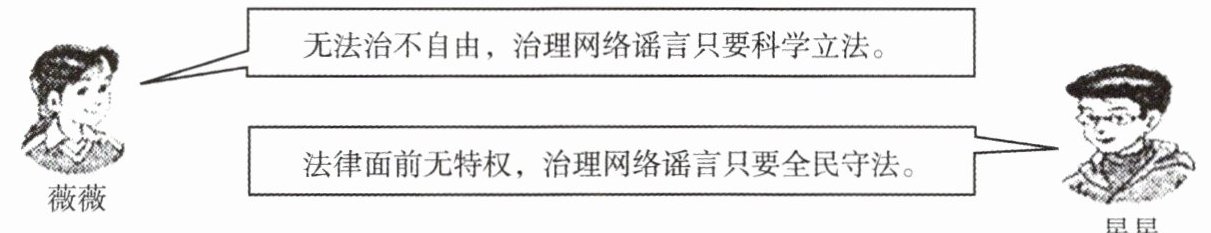 (1)选择薇薇观点:“无法治不自由”正确,法治是自由的保障,治理网络谣言需要科学立法,为其提供法律依据。但“只要科学立法”错误,治理网络谣言还需严格执法、公正司法、全民守法,需要多方面共同努力。