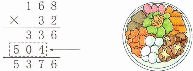 4. 盆菜在广东十分流行,是当地人喜庆节日必吃的传统菜式。周六这天某饭店卖出 32 份盆菜,每份 168 元,一共卖了多少元?福福用竖式计算(如图),虚线框中的“504”表示(