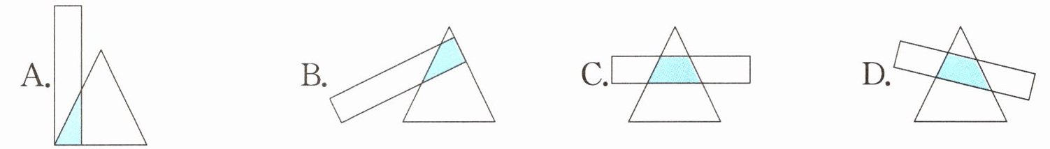 2. 数学课上,同学们想到了借助一张长方形纸条和一张三角形透明塑料胶片叠放的方法创造梯形,重叠部分不是梯形的是(