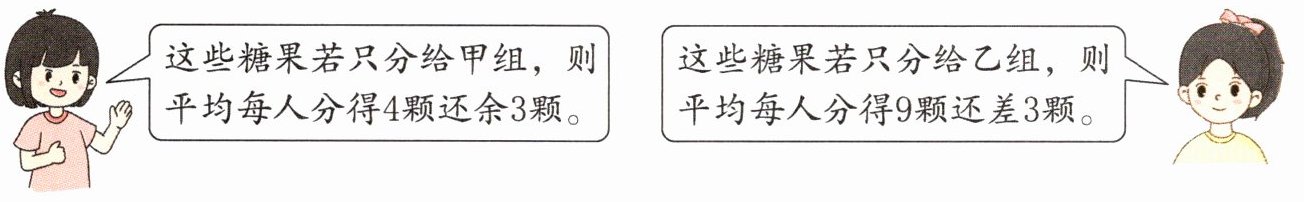 解:设乙组有x人。4×2x+3=9x-3 x=6 6×9-3=51(颗) 答:这些糖果一共有51颗。