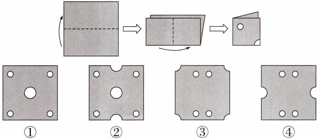 九、小华将一张正方形彩纸依次按图中的方式对折、裁剪,彩纸展开铺平后,对应的图形是(