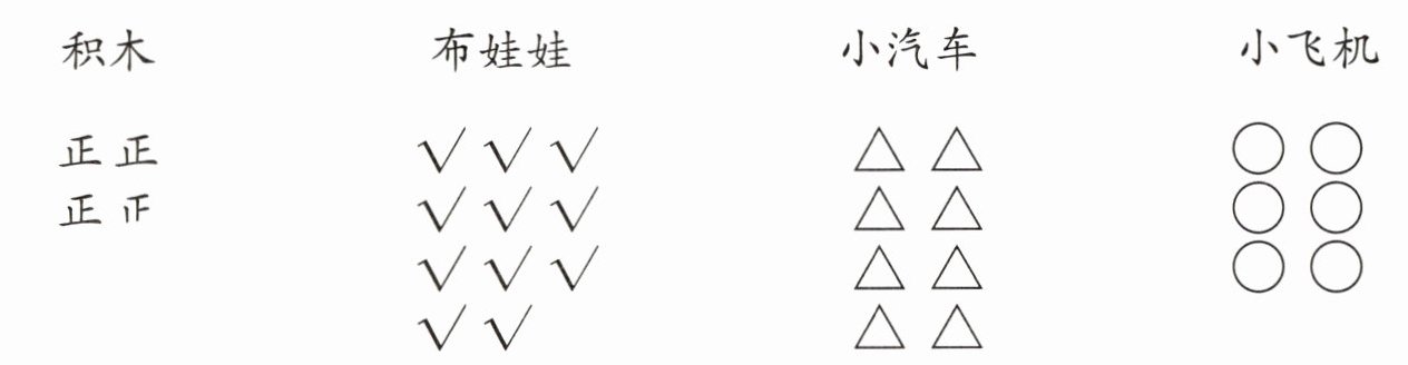 统计二(1)班同学最喜欢下面四种玩具的情况,每人只选一种,统计结果如下。