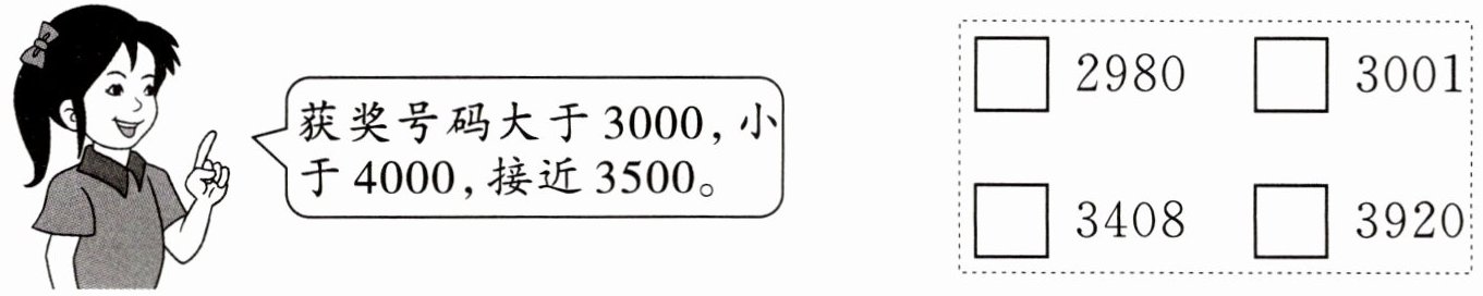 三、马戏表演前进行抽奖活动。想一想,哪个数是获奖号码?在数字前的$□$内画“√”。