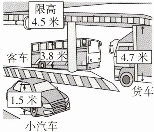 因为客车高度3.8米<桥高4.5米,小汽车高度1.5米<桥高4.5米,而货车高度4.7米>桥高4.5米,所以客车和小汽车可以从桥下经过。