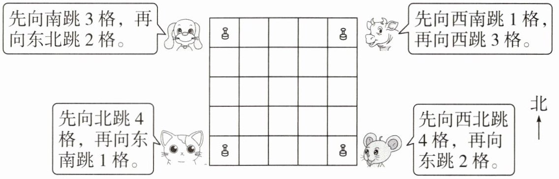 每个棋子各跳到了什么地方,你能用小动物的名字表示出来吗?