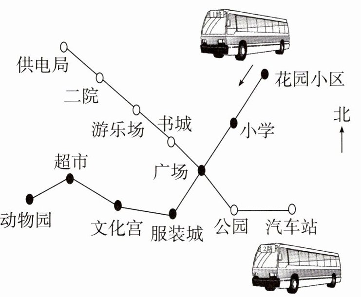 )站到达动物园。(2)2路车从汽车站出发,先向(