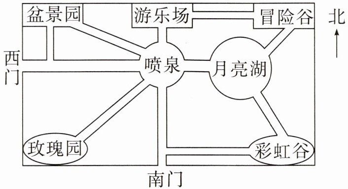 )走到月亮湖。(3)从西门到冒险谷可以先向(