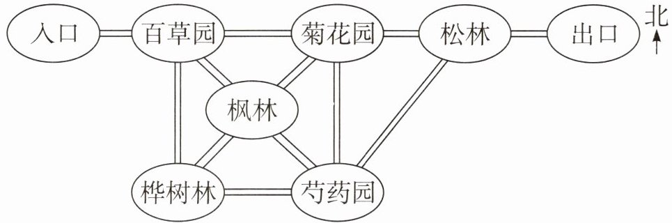 【答案】:入口→百草园→桦树林→枫林→菊花园→芍药园→松林→出口 (答案不唯一,也可以有其他合理路线,如入口→百草园→菊花园→枫林→桦树林→芍药园→松林→出口等) 。