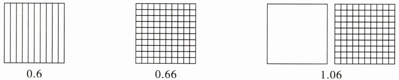 - 第三个图形(左侧1个完整正方形,右侧平均分成100份的正方形):左侧正方形全涂,右侧涂其中6份。