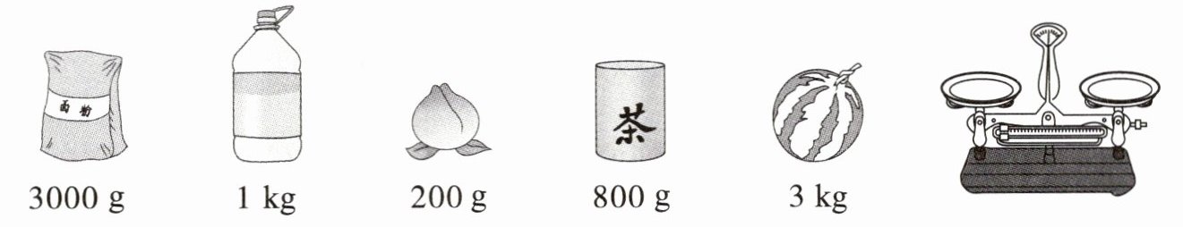【解析】:要使天平保持平衡,需让天平左右两边物品的质量相等。首先统一单位,3000g=3kg,1kg=1000g,3kg=3000g。观察各物品质量:面粉3000g(3kg)、油1000g、桃子200g、茶叶800g、西瓜3000g(3kg)。其中油(1000g)+桃子(200g)+茶叶(800g)=1000+200+800=2000g,而面粉和西瓜均为3000g,单独放置无法平衡;但1000g+200g+800g=2000g,没有与之等重的单个物品,不过3000g的面粉和3000g的西瓜质量相等,所以可将面粉和西瓜分别放在天平两边,此时两边质量均为3000g,天平平衡。(或其他合理组合,如油+桃子+茶叶=2000g,无对应质量,故最优为面粉和西瓜分别放两边)