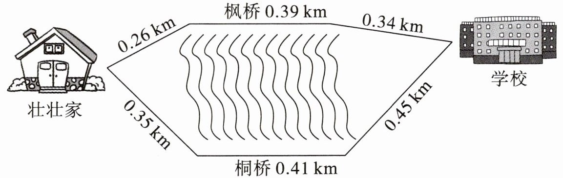 4. 学校在河的对岸,壮壮家与学校之间有两座桥。壮壮从家到学校有几种走法?各需要走多少千米?