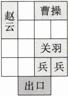 解:关羽和两个兵向左平移2格,曹操向下平移3格,赵云向右平移2格,关羽和两个兵向上平移1格,曹操向左平移1格。