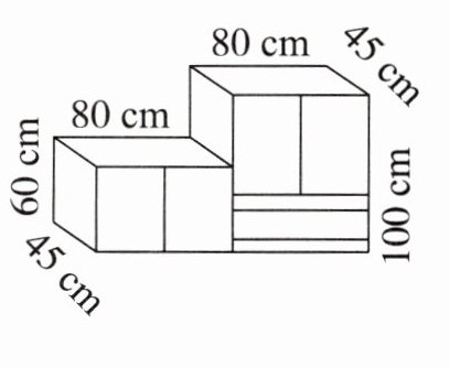 3. 一种组合体高低柜是由一个长为80cm,宽为45cm,高为60cm的长方体和一个长为80cm,宽为45cm,高为100cm的长方体组合成的(如图)。油漆工要给这个高低柜刷油漆,前后面刷浅黄色,其他露出部分都刷油绿色。刷浅黄色的面积是