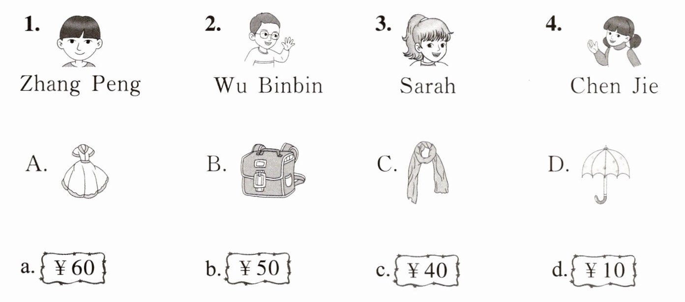I have four friends. They are Zhang Peng, Wu Binbin, Sarah and Chen Jie. Look! Zhang Peng has a nice schoolbag. It's yellow. It's forty yuan. Wu Binbin has a blue umbrella. It's expensive. It's sixty yuan. Sarah has a pretty dress. It's fifty yuan. Chen Jie has a cheap scarf. It's ten yuan.