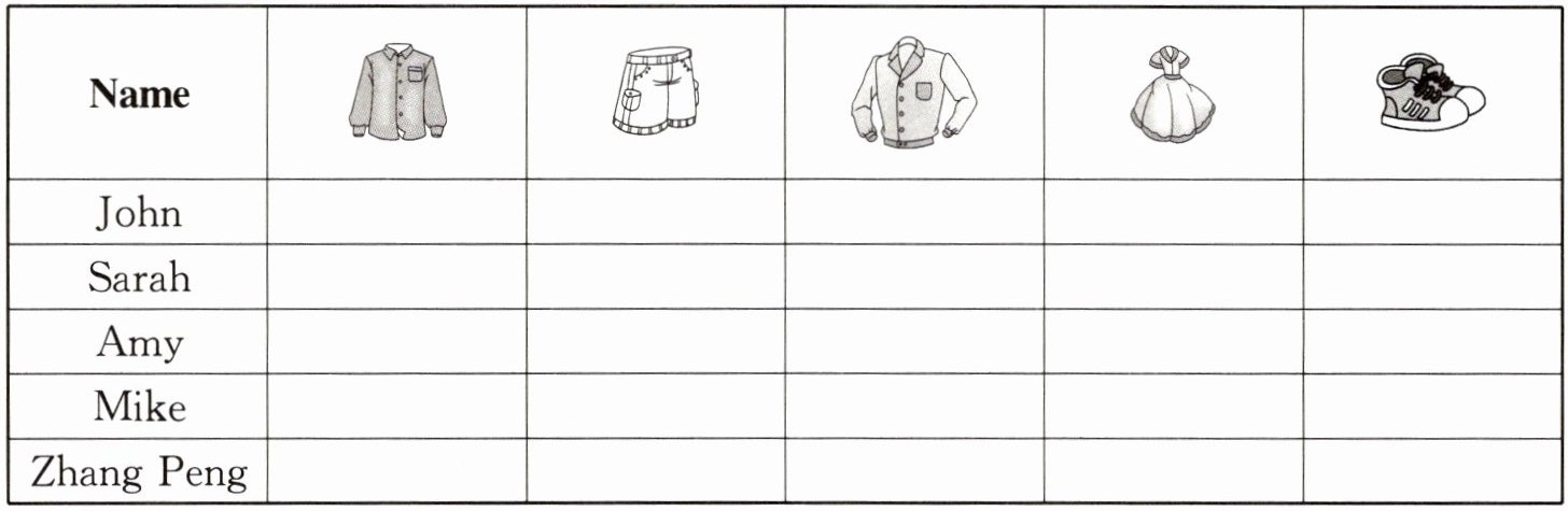 Look! This is Mike's blue shirt. That is Amy's red dress. It's pretty. John's shoes are yellow. Those are Sarah's shorts. This is Zhang Peng's jacket.