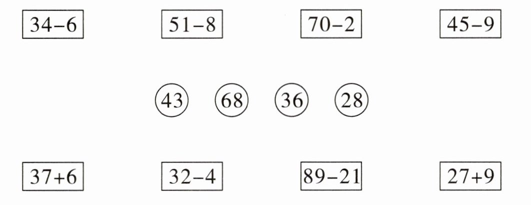 答案:$34 - 6$连$28$;$51 - 8$连$43$;$70 - 2$连$68$;$45 - 9$连$36$;$37 + 6$连$43$;$32 - 4$连$28$;$89 - 21$连$68$;$27 + 9$连$36$。