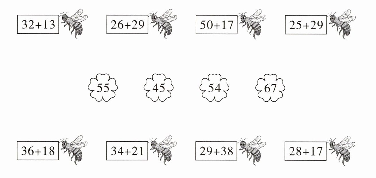 答案:$32 + 13$连$45$;$26 + 29$连$55$;$50 + 17$连$67$;$25 + 29$连$54$;$36 + 18$连$54$;$34 + 21$连$55$;$29 + 38$连$67$;$28 + 17$连$45$。