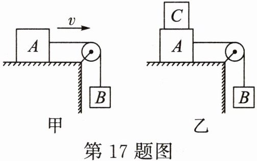 17. 物理兴趣小组自主探究得知“接触面粗糙程度一定时,滑动摩擦力的大小与压力大小成正比”,他们应用该规律及相关知识分析了如图所示的物理过程。已知物体 $ A $ 重10N,$ B $、$ C $ 重均为4N,不计绳重及其与滑轮的摩擦。当在绳端挂上物体 $ B $ 时,如图甲所示,物体 $ A $ 沿水平面向右做匀速运动,$ A $ 所受摩擦力为 $ f_1 $;接着把物体 $ C $ 放在 $ A $ 上,三者停止运动时,如图乙所示,$ A $ 所受摩擦力为 $ f_2 $;再用力 $ F $ 竖直向下拉物体 $ B $,使物体 $ A $、$ C $ 一起向右做匀速运动(水平面粗糙程度不变)。下列计算结果正确的是(