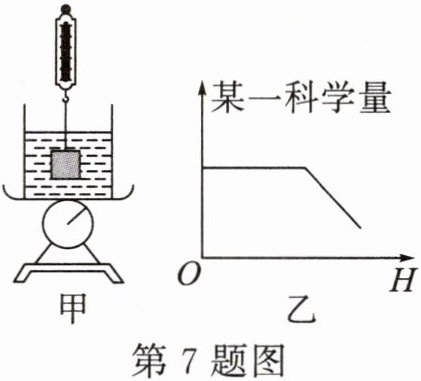 7. (沈阳)如图甲所示,用一个弹簧测力计拉着浸没在水中的小物块,现将小物块缓缓拉出水面到底部刚刚脱离水面为止。图乙图像体现了某些科学量随$H$(小物块底面到容器底面的距离)的变化情况。有下列选项:①弹簧测力计示数;②小物块受到的浮力;③台秤的示数;④容器底部受到的液体压强;⑤小物块底面受到的压强。符合图乙图像变化的是(