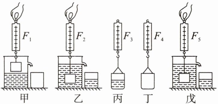 (4) 在完成实验之后,小陶同学发现实验桌上有一瓶用于测量密度的盐溶液,她思考之后建议:利用浮力来测量该液体的密度,经过组内一番讨论,仅增加了图戊(注意:图戊中是盐水,图乙中是水)所示情景,此时弹簧测力计示数为$F_{5}$,则待测盐溶液的密度$\rho_{液}可表示为\frac{X}{F_{1}-F_{2}}\rho_{水}或\frac{X}{F_{3}-F_{4}}\rho_{水}$,其中$X= $