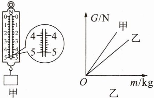 N。(5)小明对太空中的星球比较感兴趣,他从网上查得:甲、乙两个星球表面上物体的重力$(G)与其质量(m)$的关系如图乙所示。从图中信息可知,相同质量的物体在甲星球表面上的重力