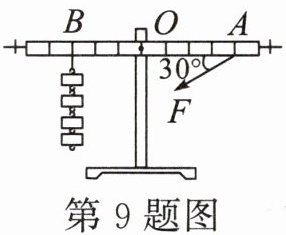 9. (广元)如图所示,在“探究杠杆平衡条件”的实验中,轻质杠杆上每个小格长度均为2cm,在B点竖直悬挂4个重均为0.5N的钩码,在A点用与水平方向成30°角的动力F拉杠杆,使杠杆在水平位置平衡。对该杠杆此状态的判断,下列说法正确的是 (