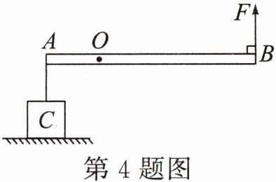 4. (眉山)如图所示,以O为转轴的轻质杠杆AOB,AB= 4OA,物体C重240N,底面积为$200cm^2,$在杠杆A端与物体的上端中点用一根轻质硬棒连接,当在B端用120N的动力F竖直向上拉时,杠杆AOB在水平位置平衡,该杠杆为