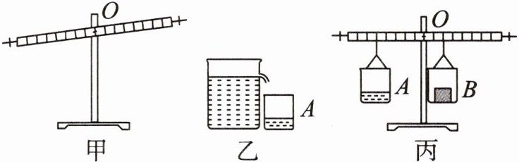 (选填“大于”“小于”或“等于”)玉石的体积。(3)将玉石从溢水杯中取出,擦干后放入另一相同小桶B中,将装有水和玉石的A、B两个小桶分别挂在已水平平衡的杠杆两端,移动两小桶在杠杆上的位置,直到杠杆在水平位置恢复平衡,如图丙所示。此时小桶A、B的悬挂点离支点O的距离分别为10cm和4cm,若不考虑小桶重力,$\rho_{水}= 1.0×10^{3}kg/m^{3}$,则该玉石密度的测量值为