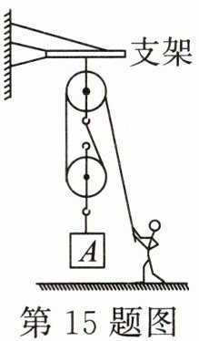 15. 在某场馆建设中,采用如图所示的装置,滑轮组悬挂在水平支架上,工人站在水平地面上,竖直向下拉动绳子自由端,使物体A在5s内匀速上升了1m。已知物体A重400N,该工人重500N,两个滑轮质量相等,不计滑轮组的绳重和摩擦,滑轮组的机械效率为80%。关于该过程,下列说法正确的是 (