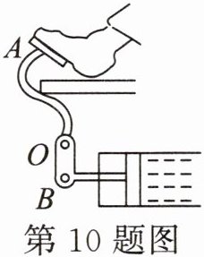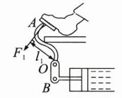 10. 如图所示为汽车液压刹车装置的一部分。该装置中AOB实为一个杠杆,O是杠杆的支点,请画出刹车时它所受的动力$F_{1}和动力臂l_{1}$。