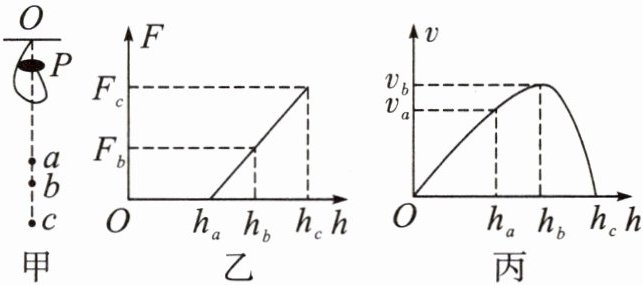 3. 某同学用小球和弹性很好的轻质橡皮筋等器材进行了如下实验与探究:让一系于橡皮筋一端的小球从某悬挂点O的正下方P点由静止释放,如图甲所示,整个下落过程中,橡皮筋所受弹力F与小球下落高度h的关系如图乙所示,小球下落的速度v与下落高度h的关系如图丙所示。已知该轻质橡皮筋每受到0.3N的拉力就伸长1cm,经测量小球从P点下落到a、b、c三点的距离分别为$h_{a}= 0.4m$,$h_{b}= 0.6m$,$h_{c}= 0.9m$。(不计空气阻力)
