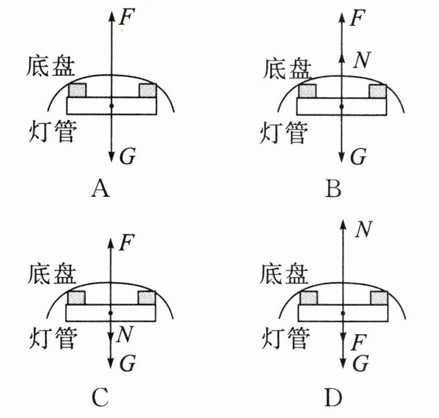 8. 小明家吸顶灯的灯管坏了,爸爸网购了一个带有磁铁的灯管。由于吸顶灯的底盘是铁皮,灯管被牢牢地吸在底盘上。用G表示灯管的重力,F表示底盘吸引灯管的力,N表示底盘给灯管的弹力,下列选项中有关灯管的受力分析示意图,正确的是(