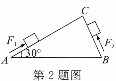 2. (达州) 如图所示, $ AC $、$ BC $ 为同一水平面上的两个光滑斜面, $ AC>BC $, $ \angle CAB= 30^{\circ} $。在相等时间内把重为 $ 80 \mathrm{~N} $ 的同一物体从斜面底端分别沿 $ AC $、$ BC $ 匀速推至 $ C $ 点, 物体的机械能