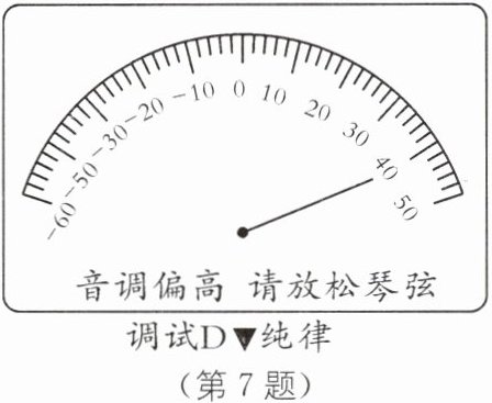 7. (2025·河南洛阳期末)古筝是中国独特的民族乐器之一,为了保持音准,弹奏者常使用调音器对每根琴弦进行调音。如图所示是某古筝调音器软件的界面,指针指向 40 表示音调偏高,需放松琴弦。下列指针指向的数字中表示需拧紧琴弦,且最接近标准音(指针指在 0 处为标准音)的是(
