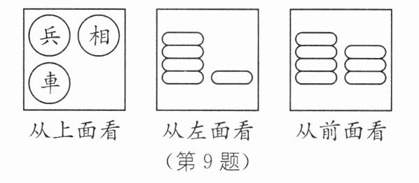 9. 在棋盘上叠一些中国象棋棋子,从上面、左面、前面看到的图形如图,这些棋子共有(