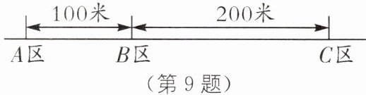 9. 分类讨论思想 如图所示,某公司有三个住宅区,A,B,C各区分别住有职工30人,15人,10人,且这三点在一条大道上(A,B,C三点共线),已知$ AB = 100 $米,$ BC = 200 $米.为了方便职工上下班,该公司的接送车打算在此间只设一个停靠点,为使所有的人步行到停靠点的路程之和最小,那么该停靠点的位置应设在哪里?