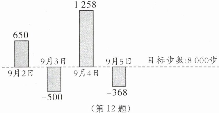 12. (2025·山东青岛期中)如图,小李在某运动APP中设定了每天的步数目标为8000步,该APP用正数表示超过目标步数的步数,用负数表示少于目标步数的步数.
