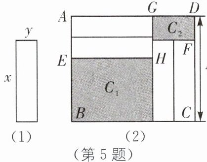 5. (2025·石家庄裕华区一模)将4个如图(1)所示的长为$x$,宽为$y(x>y)$的小长方形按照图(2)的方式不重叠地摆放在大长方形$ABCD$中,$CD= 4$,大长方形$ABCD中未被覆盖的两部分分别记为C_1和C_2$.