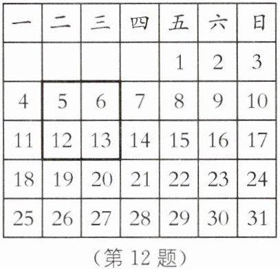 12. 实验班原创 在我们日常生活中的月历上也隐藏着许多的数学规律. 如图是某年3月份的日历,一个实线方框圈出的$2×2$(2行2列)个数字之和为$5 + 6 + 12 + 13 = 36$.
