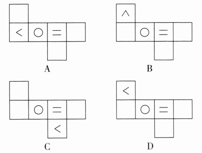 D 根据正方体表面展开图中“相对面”的判断方法可知,A项中面“<”与“二”是相对面,故A项不符合题意;再根据上面“∧”符号开口和位置,可以判断D项符合题意,B项、C项不符合题意。