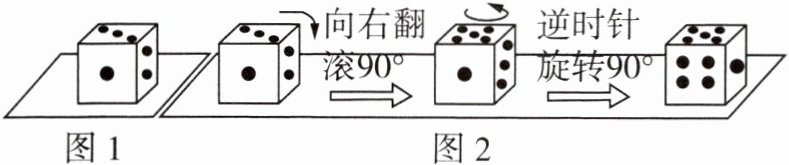 15 [创新意识][2025宝鸡期中]将正方体骰子(相对面上的点数分别为1和6,2和5,3和4)放置于水平桌面上,如图1。在图2中,将骰子向右翻滚90°,然后在桌面上按逆时针方向旋转90°,则视作完成一次变换。若骰子的初始位置为图1所示的状态,那么按上述规则连续完成9次变换后,骰子朝上一面的点数是______。