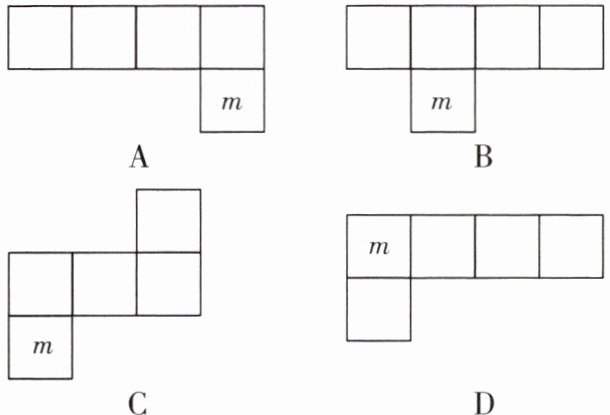 A 因为正方体盒子无盖,所以标有字母m的底面没有相对面,故C项、D项不符合题意;因为沿箭头所指方向将盒子剪开,所以底面与侧面中从右边数第1个正方形相连,A项符合。