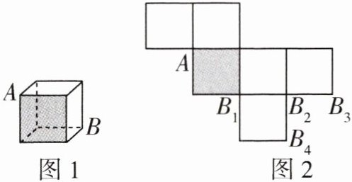 10 如图1,点A,B是正方体的两个顶点,将正方体按图2中所示的方式展开,则在图2中B点的位置为 ( )