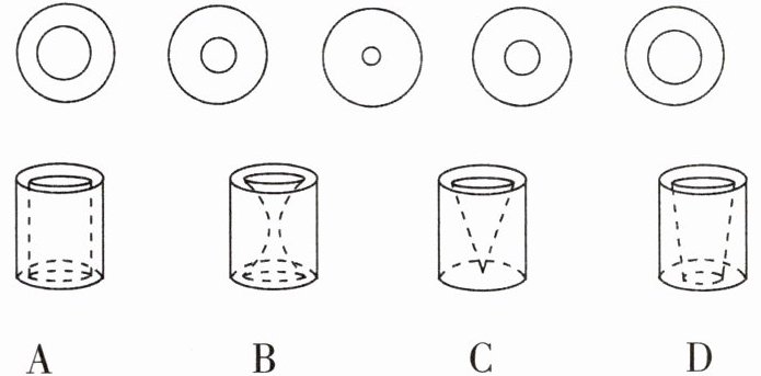 9 [2025深圳龙岗区月考]一个物体的外形是圆柱,但不清楚它的内部结构,现在用一组平行于底面的平面去截这个物体,从上至下的5个截面图形如图所示,则这个物体可能是下列选项中的 ( )