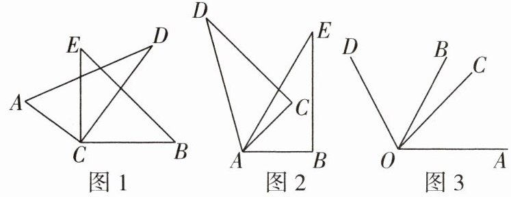 (3)已知$∠AOB=α,∠COD=β$(α,β都是锐角),如图3,若把它们的顶点O重合在一起,请直接写出$∠AOD$与$∠BOC$的数量关系,不必说明理由。