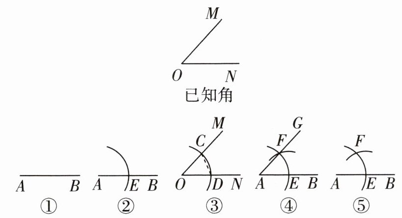 1 [教材P124例2变式][2024长春双阳区期末]如图,在用直尺和圆规作一个角等于已知角时,小李进行了以下五个步骤,将这5个步骤按正确的顺序排列为( )