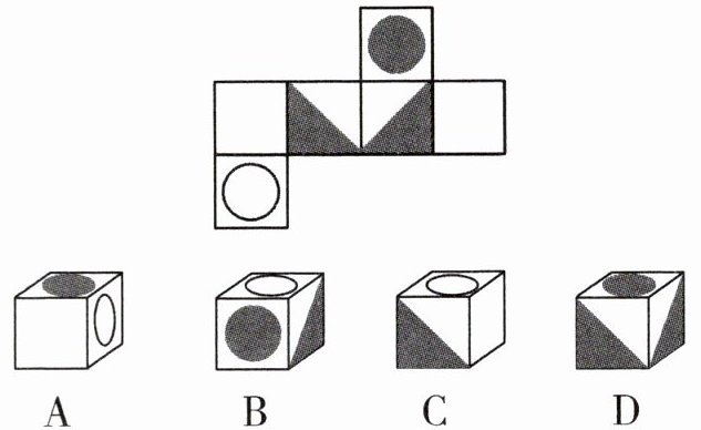 D 由2个圆所在的面是相对的,排除A,B。根据表面展开图中2个无阴影三角形的位置可以判断:折叠后2个无阴影三角形有一直角边重合,排除C。
