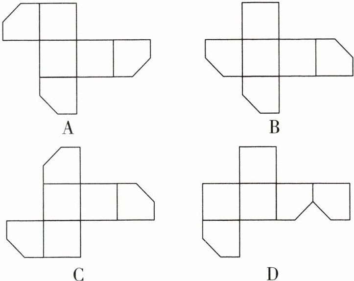 2 [2024南昌期中]如图,在一个正方体纸盒上切一刀,切面与棱的交点分别为A,B,C,切掉角后,将纸盒剪开展成平面,则展开图不可能是 ( )